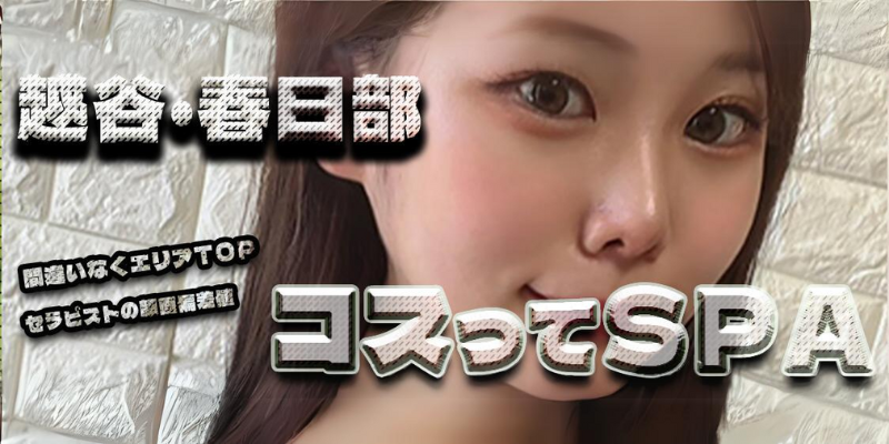 春日部にある「コスってspa春日部」は可愛い女の子専門店です。総じて若めのセラピストたちは基本的にJK風の衣装で施術、背徳感、青春が混ざり合って訪れる新感覚を味わえます。キラキラ輝くような女の子達は、アロマオイルやホイップの扱いも素晴らしく卓越のテクニックを発揮。危ないほどの興奮施術は理性を常に保たなくてはなりません。ハードなオプションとしてTバックスタイルのコスプレもありますので、限界ギリギリの興奮を味わってください。基本料金は80分15,000円です。ルームは春日部駅の近くに用意されているのでアクセスが簡単。またホテルへの出張サービスもあります。利用しやすさが魅力、ぜひ気軽に可愛い女の子に会いに向かってみましょう。
